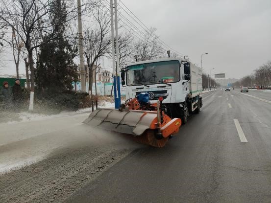 公司迅速集结23名工作人员,调配除雪车、融雪剂洒布车各1台,前往渤海十三路(黄河一路至黄河二路段)开展开除雪作业。